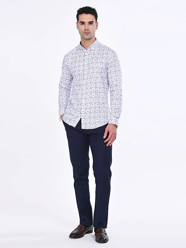 Elevate your wardrobe with this geometric design shirt, featuring a classic collar and a full button placket. Designed with full sleeves and a curved hemline, it showcases a refined twill print. The classic fit ensures comfort and timeless style, making it a versatile addition to any collection.